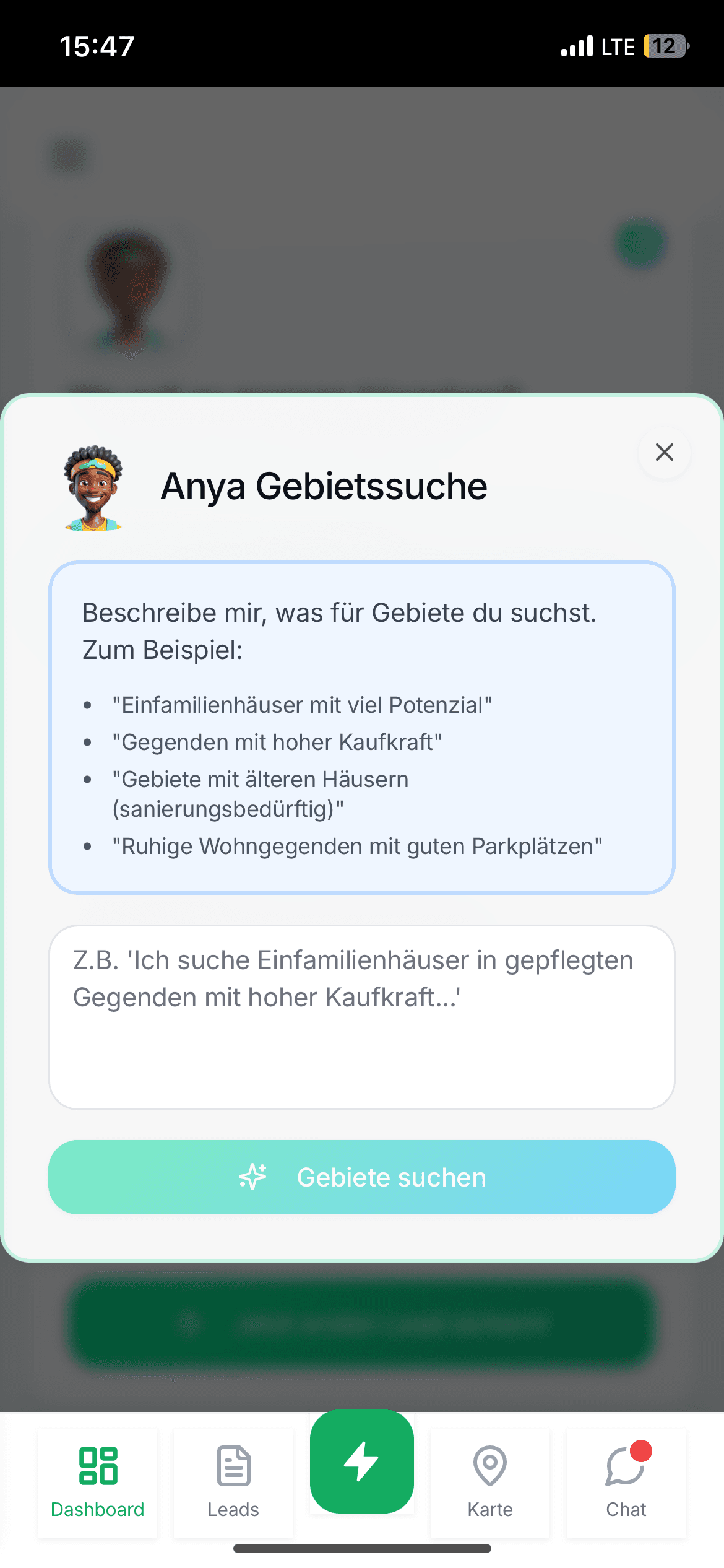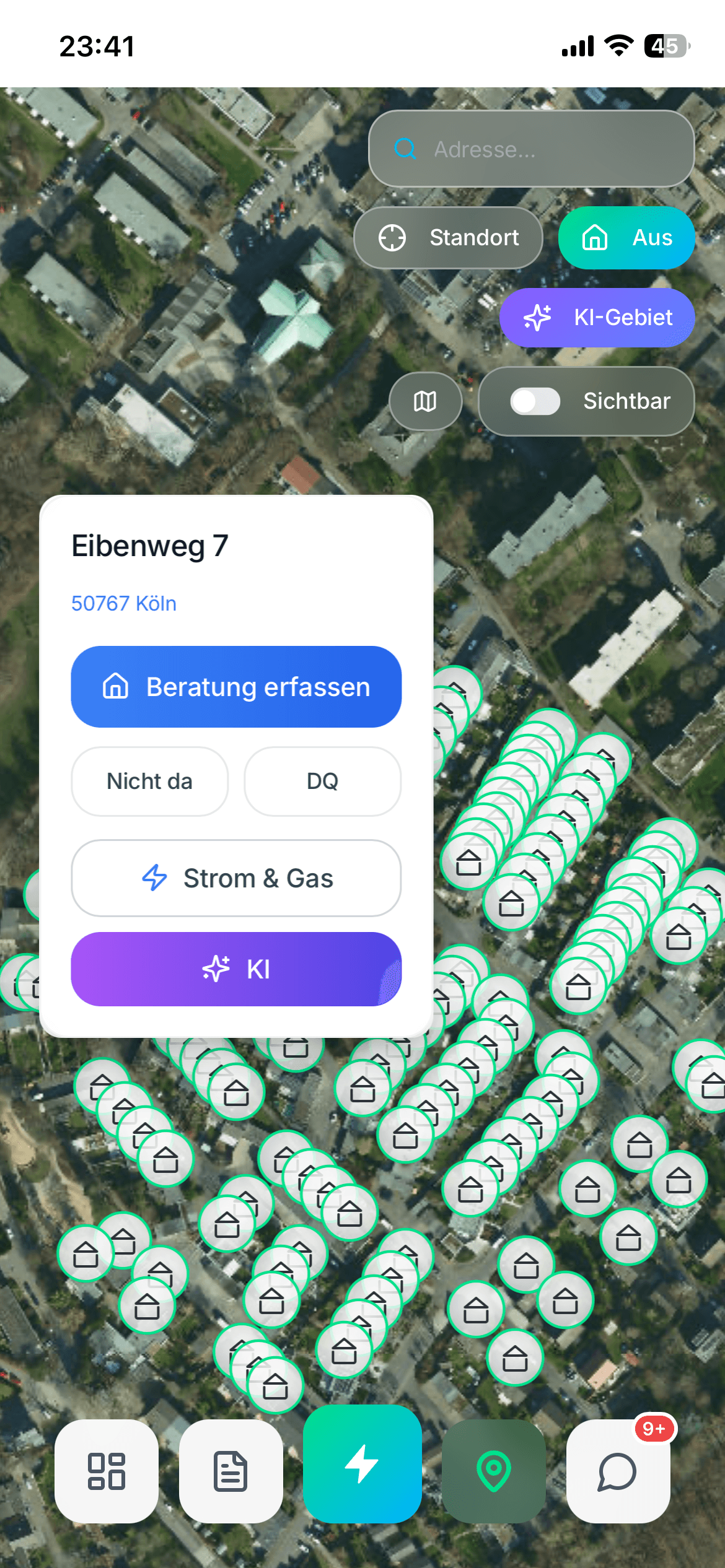 Live-Daten, um dir die besten Straßen und Eigentümerprofile zu zeigen. Reihenhäuser, junge Familien oder Eigentümer mit Dachpotenzial – die KI erkennt, wo sich dein Einsatz wirklich lohnt. Du startest, sie denkt mit.